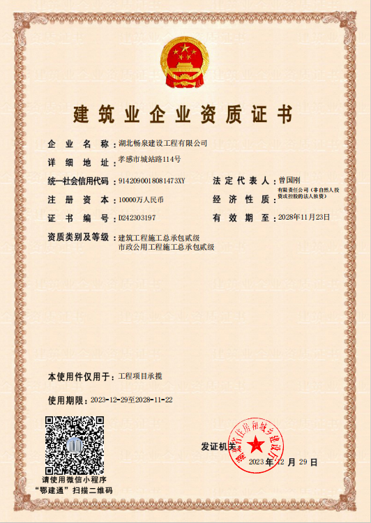 11月27日晉升“建筑工程施工總承包貳級資質”后,1229日,九度城服集團自來水公司所屬的湖北暢泉建設工程有限公司再傳喜訊,又獲“市政公用工程施工總承包貳級資質”,榮升“雙貳級”,為2024年元旦獻上了一份厚禮。